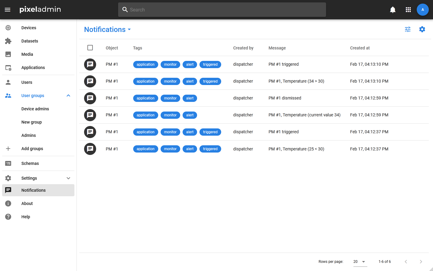 The Pixel Admin application has a notification system (notifications): they can be generated by the system when certain events occur, and can also be sent by users through the application interface.